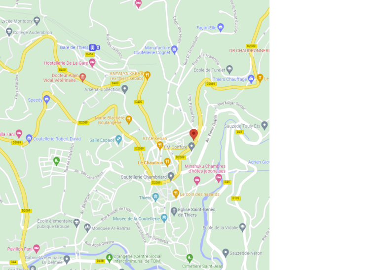 Nous trouver Vous pouvez nous rejoindre à l’adresse suivante : 6 Rue de Lyon 63300 Thiers (L’accès à l’église se trouve dans la cour) Stationnement Plusieurs parkings se trouvent à proximité de l’église. 1 Rue Edgar Quinet Les places intérieures sont limitées et strictement réservées aux personnes à mobilité réduite et au Pasteur. Réseaux sociaux Youtube Instagram Facebook